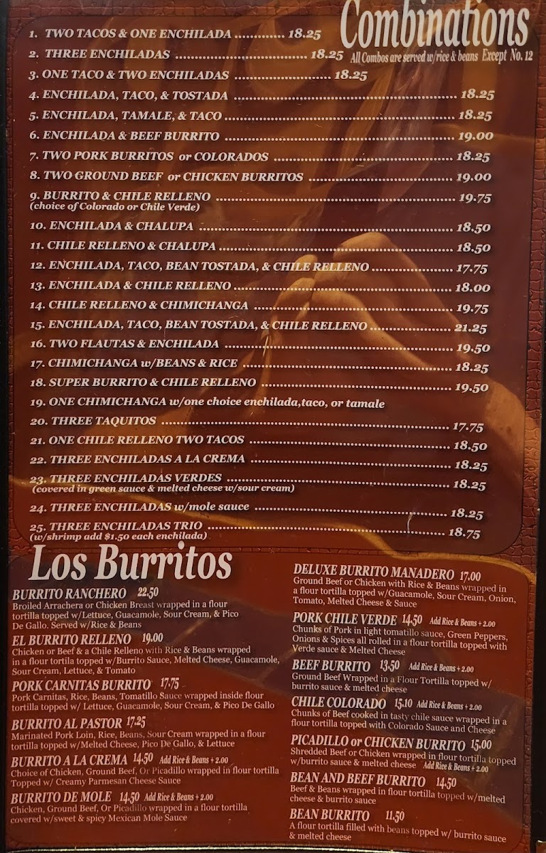 Ground beef or chicken breast, chile relleno, rice and beans, wrapped in a flour tortilla then topped with burrito sauce melted cheese, guacamole, sour cream, lettuce, and tomato.