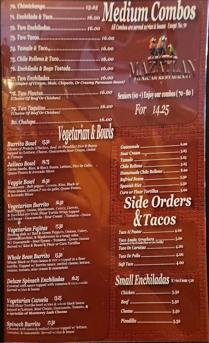 Spinach wrapped in a flour tortilla, covered with sauce and melted cheese. Topped with lettuce, tomato, and guacamole. Served with rice and beans.