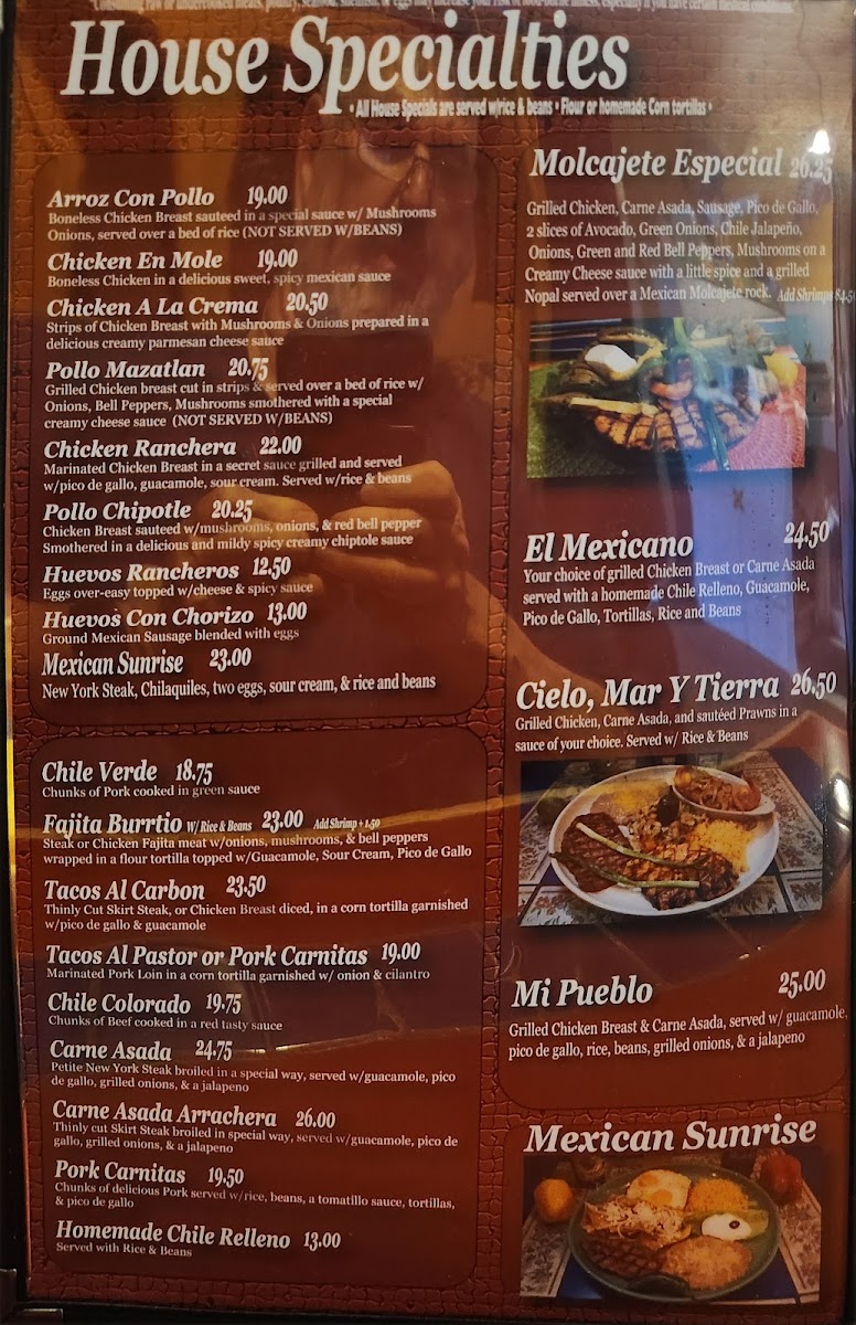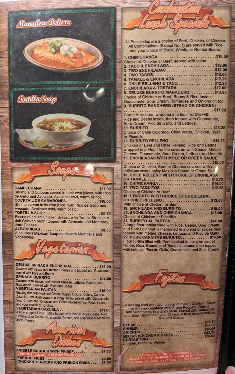 Large tortillas filled with spinach and covered with sauce. Topped with tomatoes and guacamole. Served with rice and beans.