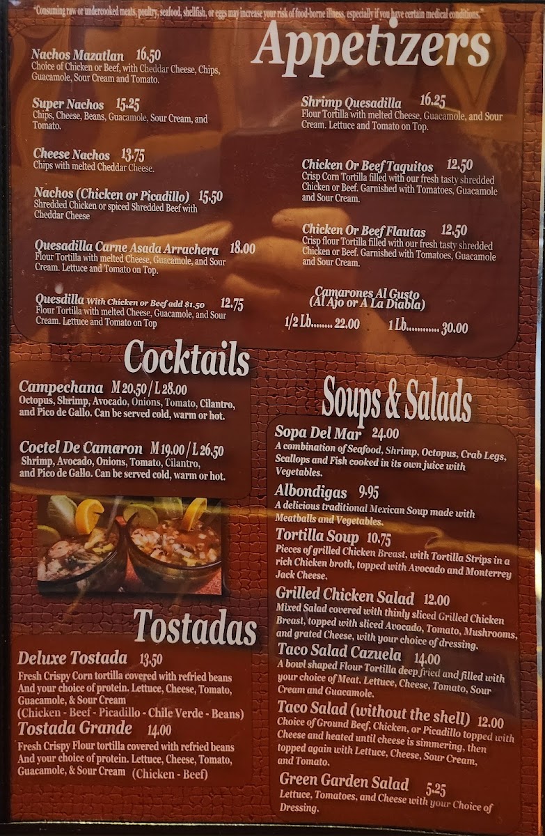Two corn tortillas filled with scallops, shrimp, and crab meat. Covered with your choice of green, red or cream sauce. Garnished with jack cheese, tomatoes, and sliced avocado.