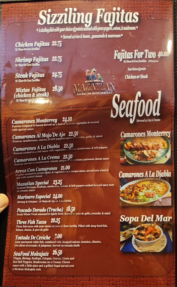 Scallops, shrimp, and crab meat wrapped in a flour tortilla topped with melted cheese, and your choice of red, green, or cream sauce. Topped with lettuce, guacamole, and sour cream. Served with rice and beans on the side.