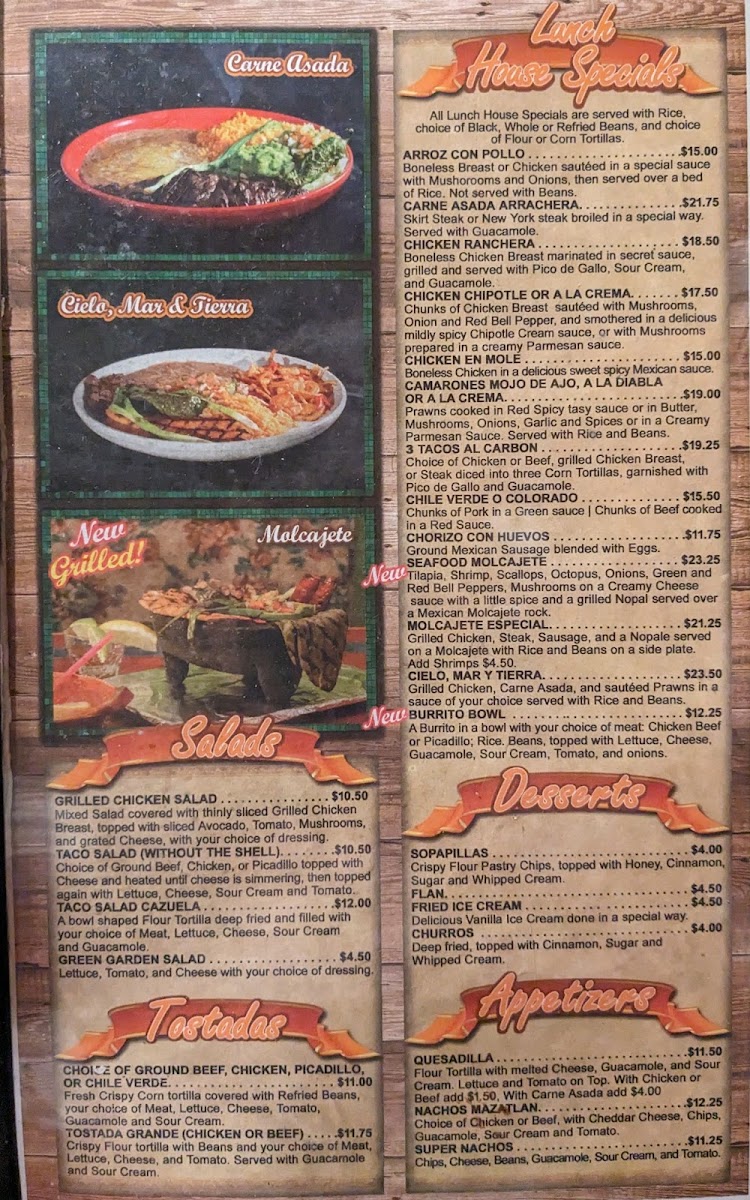 Sizzling dish with red and green peppers, onions, celery, carrots, zucchini, and mushrooms in a tangy salsa. Served with guacamole, sour cream, and tomatoes. Topped with green onions. Rice and beans on the side. Choice of flour or homemade corn tortillas.